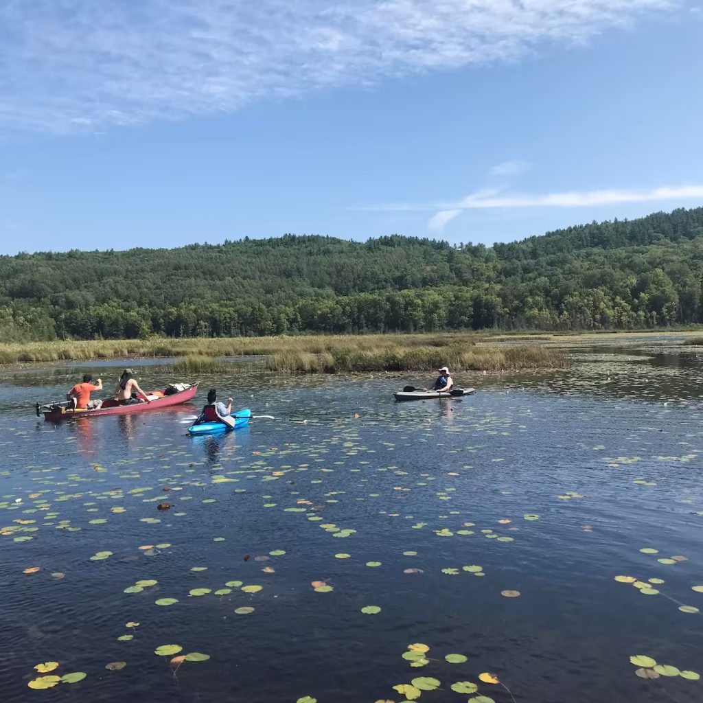 Kayaks, a canoe, paddle boards, a pedal boat, and a pontoon are available on a first-come basis with life jackets provided; while swimming is limited, a short paddle leads to cooler waters or Lac des Îles for a scenic picnic, and guided pontoon rides with the landlord as captain are also offered.