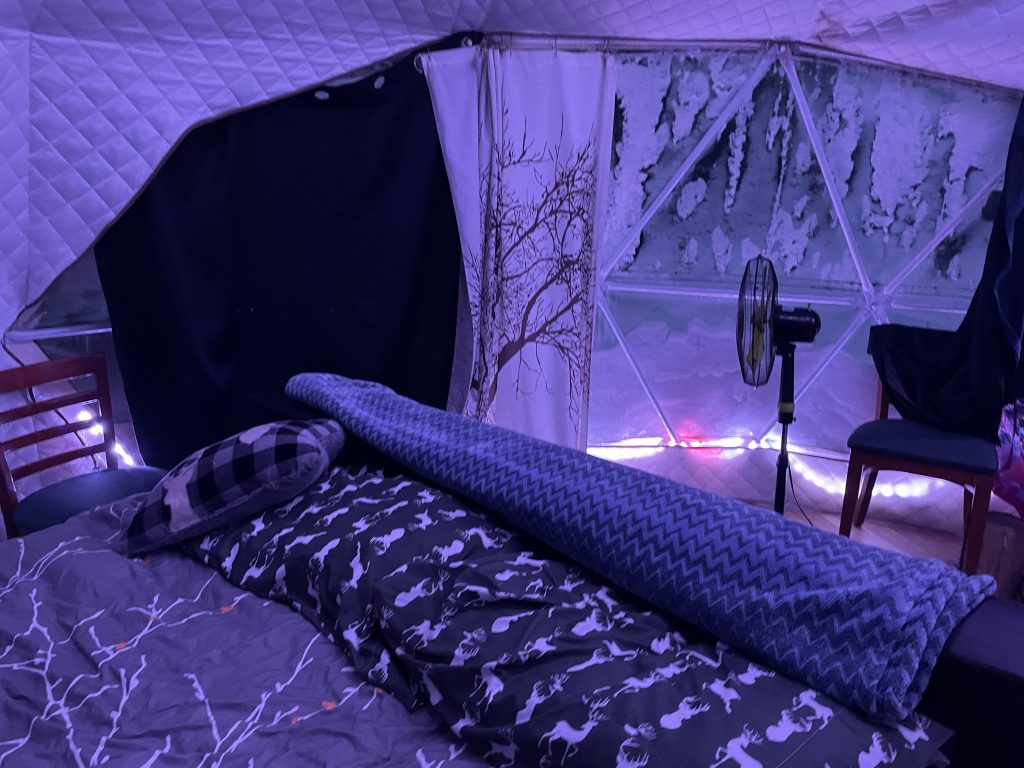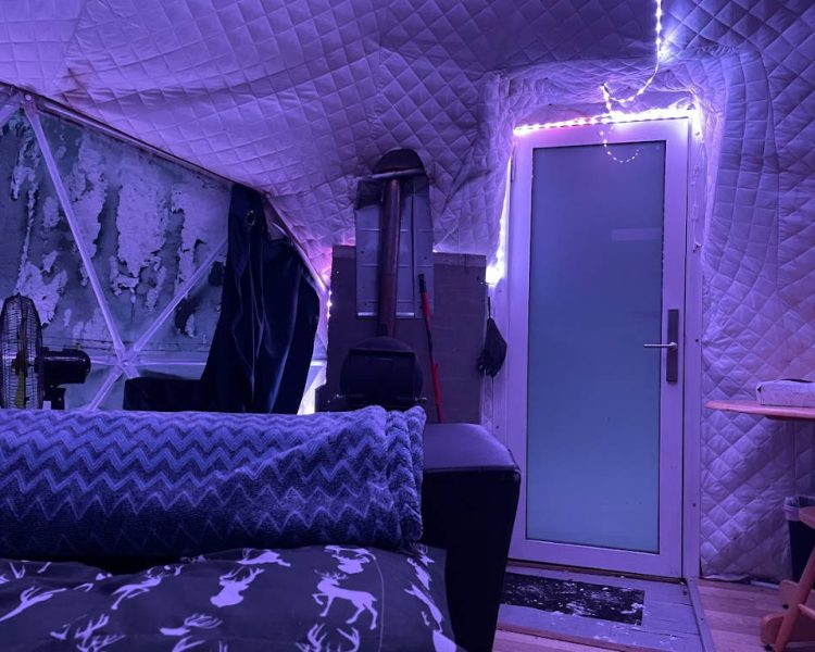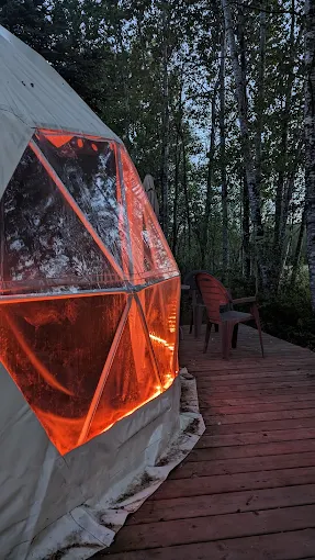 This unique glamping dome offers luxury comfort in a natural setting, featuring a queen bed, kitchenette, private firepit, and panoramic skylight for stargazing. Ideal for couples seeking a romantic getaway that blends outdoor adventure with modern amenities.